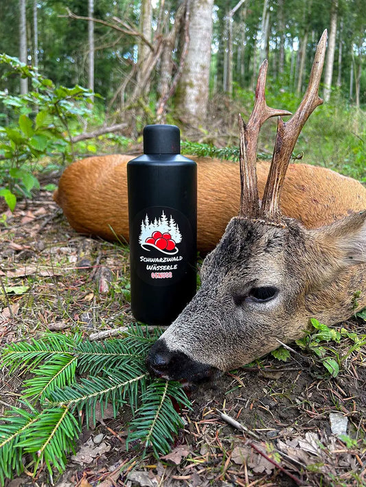 The Schwarzwaldwässerle salt spray contains mineral salt and trace elements that are important for game. It can be used for hunting wild boar, roe deer, red deer and fallow deer. The salt spray contains additional aromatic substances to attract game to the salt lick and bind it to the lick for the long term, ensuring that the game finds the salt lick and quickly accepts it. By applying the aromatic substances directly to the trunk of the salt lick and spreading them over a large area, they penetrate deep into the wood.